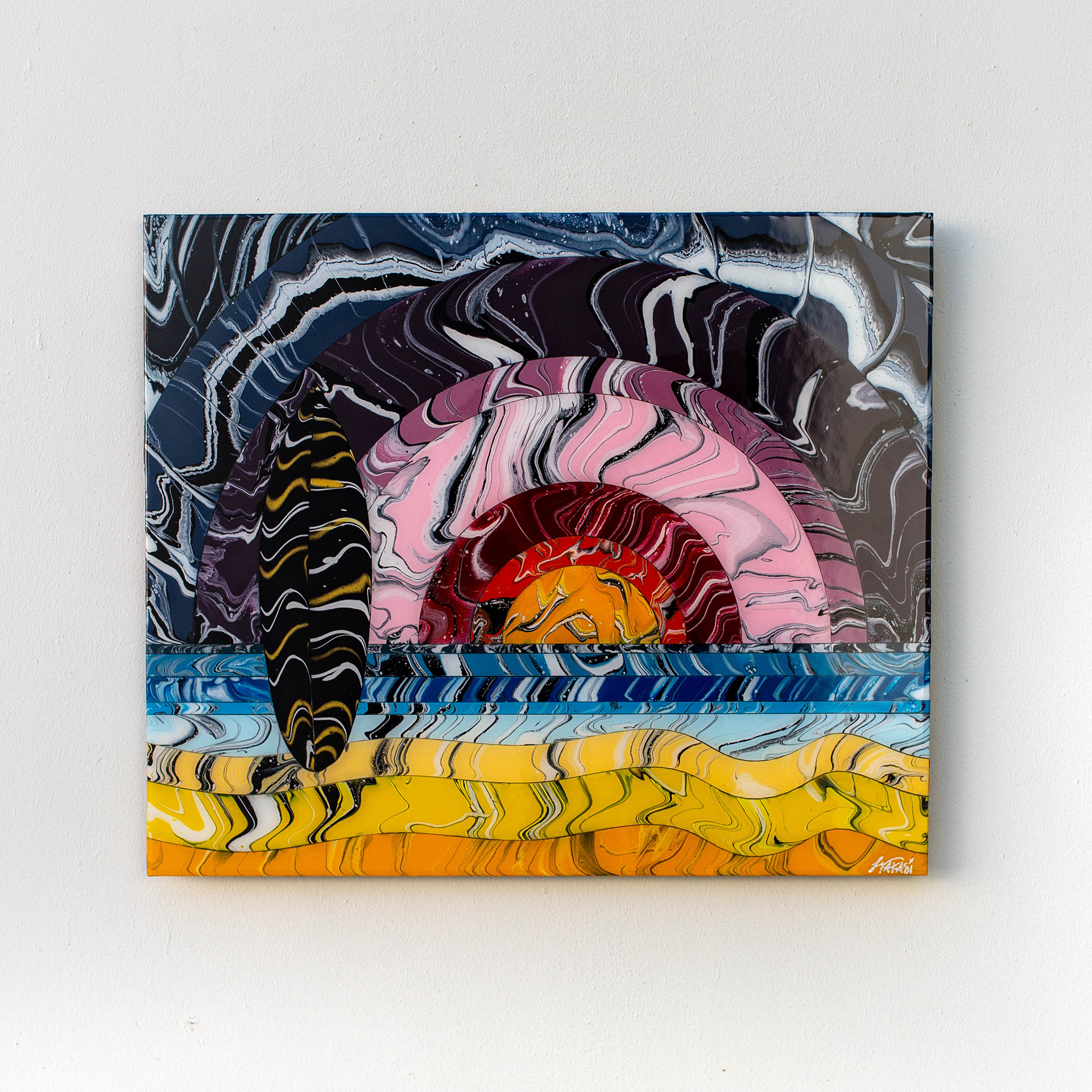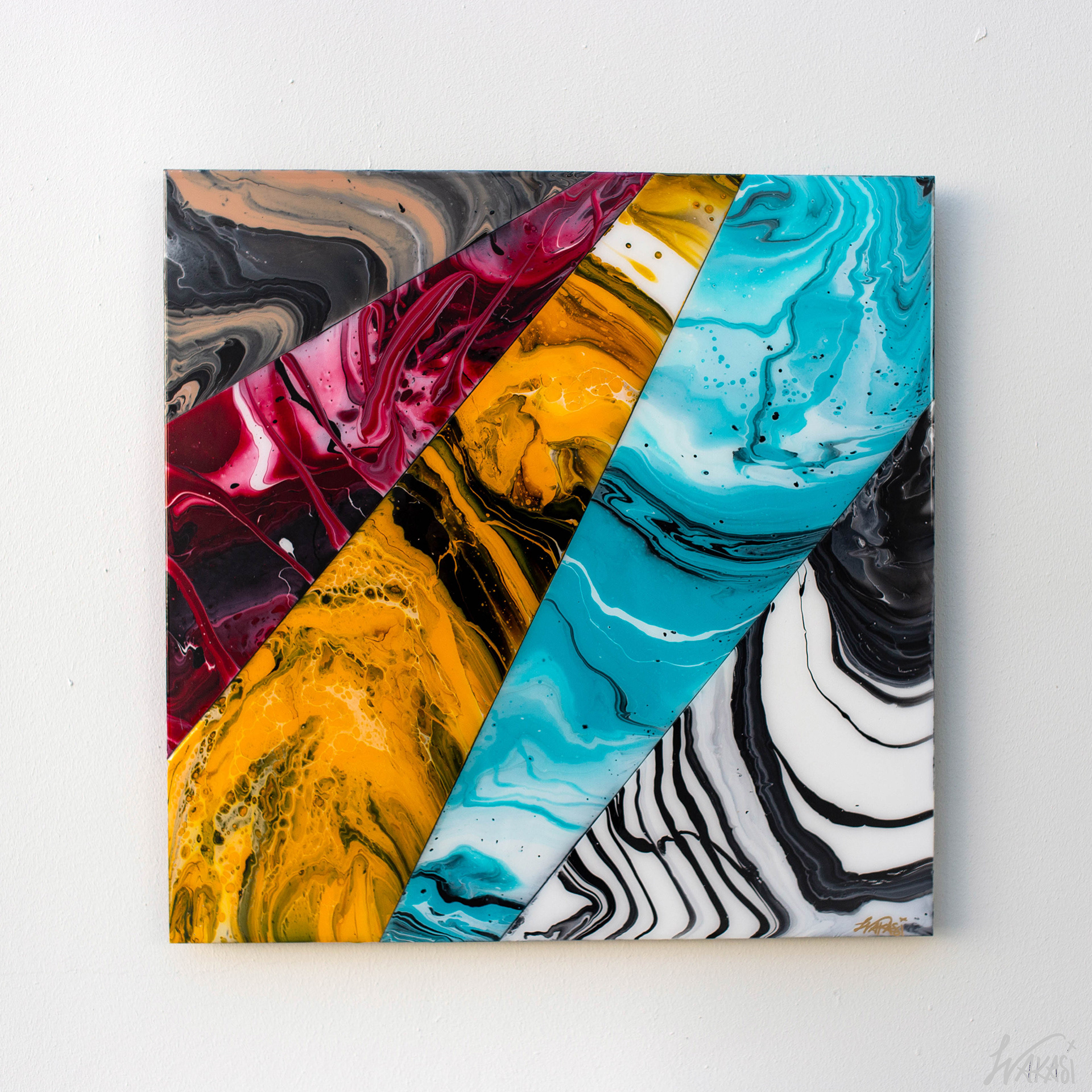 ​​​​​​​A combination of laser cut MDF plywood, acrylic pouring and epoxy resin.